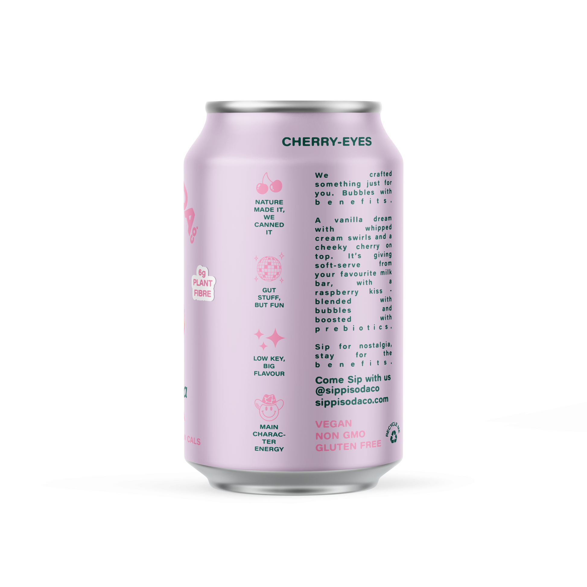 It’s giving soft-serve from your favourite milk bar — whipped-cream swirls, cheeky cherry on top, and a fizz that feels like first love. Blended with bubbles and boosted with prebiotics, this is gut stuff, but fun.